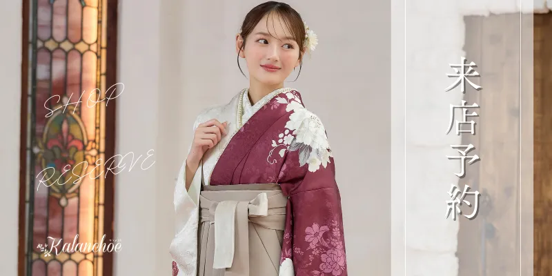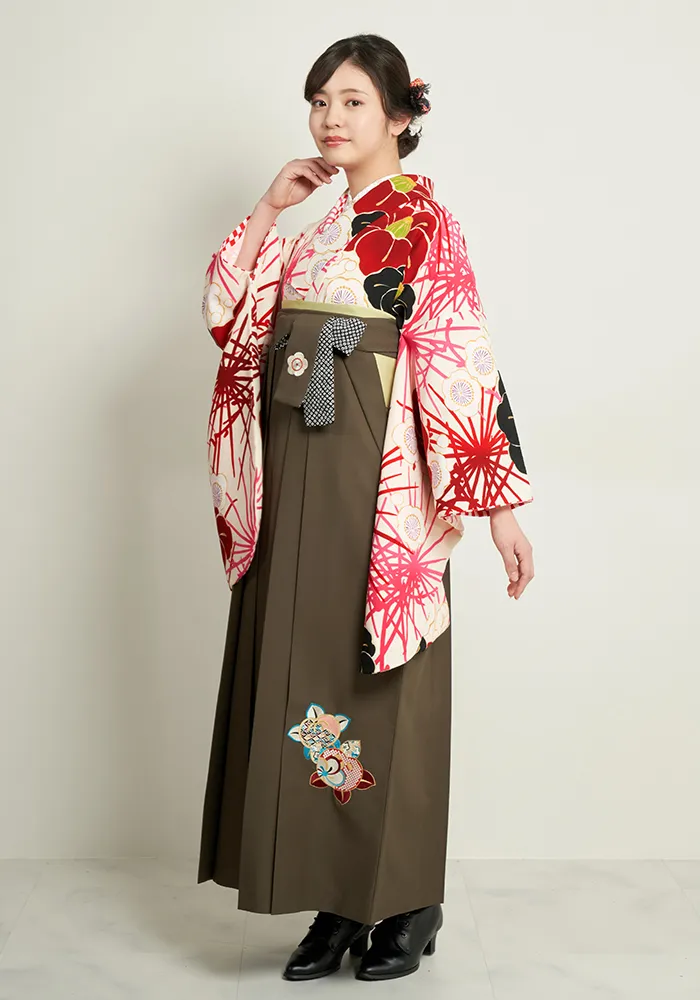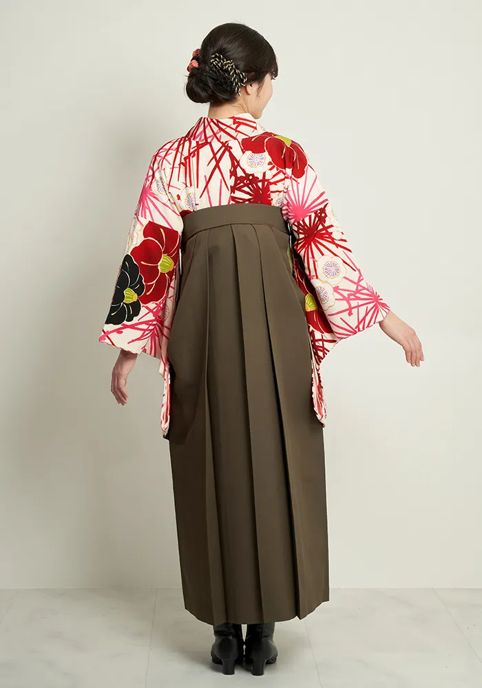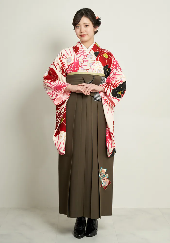 【着物】クリーム椿に松+【袴】チャコールブラウン刺繍